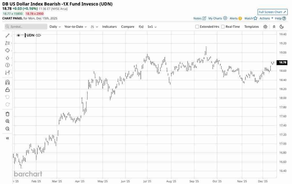 At $18.78 per share on December 15, 2025, UDN remains in a trading range, tracking the U.S. dollar index. UDN had nearly $153.75 million in assets under management and trades an average of 132,400 shares per day. UDN is a liquid bearish dollar index ETF that charges a 0.77% management fee.Â