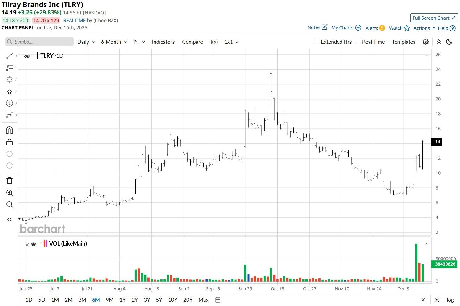 Following today’s surge, Tilray stock is up more than 100% versus its recent low set on Dec. 4.