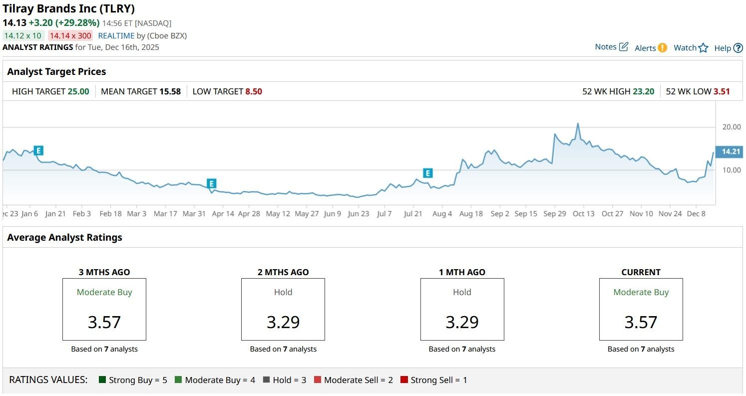 According to Barchart, the consensus rating on TLRY shares remains at “Moderate Buy” with price targets going as high as $25 indicating potential upside of more than 75% from current levels.