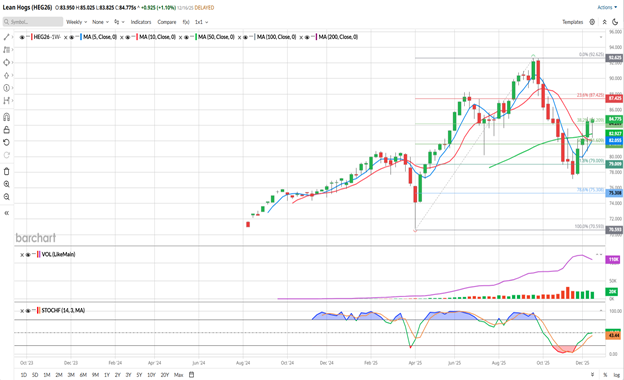 The weekly view of Lean Hogs show the February contract shows me that this market has been in an uptrend for its life. The 8 weeks of bearish trade that we saw from late-September until mid-November was just a 62% retracement, as you might notice from the Fibonacci retracement on the chart. That’s drawn from the April low to the September high, a bit different that the one I have drawn on the daily chart above. Prices have rebounded and are back up over the 50-week average (green, 82.927) The 5-and 10-week moving averages (blue/red, 82.055/82.06, respectively) are thisclose to making a bullish crossover on the weekly chart, as they’re currently just decimal points apart. Unless the price falls immediately and dramatically over the rest of the week, I would expect that bullish weekly signal to be in place in the next day or two. All of the weekly moving average values that I mentioned are below the market and should offer some support. I wouldn’t expect it to zoom straight up, but I would expect pork prices to remain firm and likely set new contract highs once we get into 2026. There are the December Quarterly Hog & Pig and Monthly Cold Storage reports that come out next Tuesday, the 23rd. With recent inventory reports indicating that the US Hog herd has been shrinking, I see no reason for the December reports to be bearish. As we get closer to report day, contact me for estimates on production.