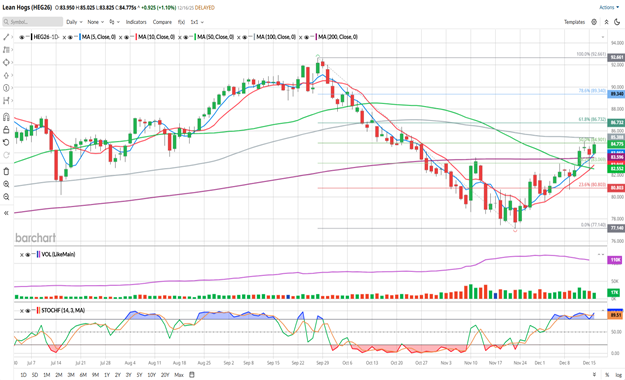 Seasonally, Hog prices tend to be choppy, with a bias to head lower until the middle of January. You can view Barchart’s seasonal data here. However, in my opinion the Lean Hogs seasonal patterns have not been in place, with the market diverging several times through the past year and shouldn’t be followed blindly.