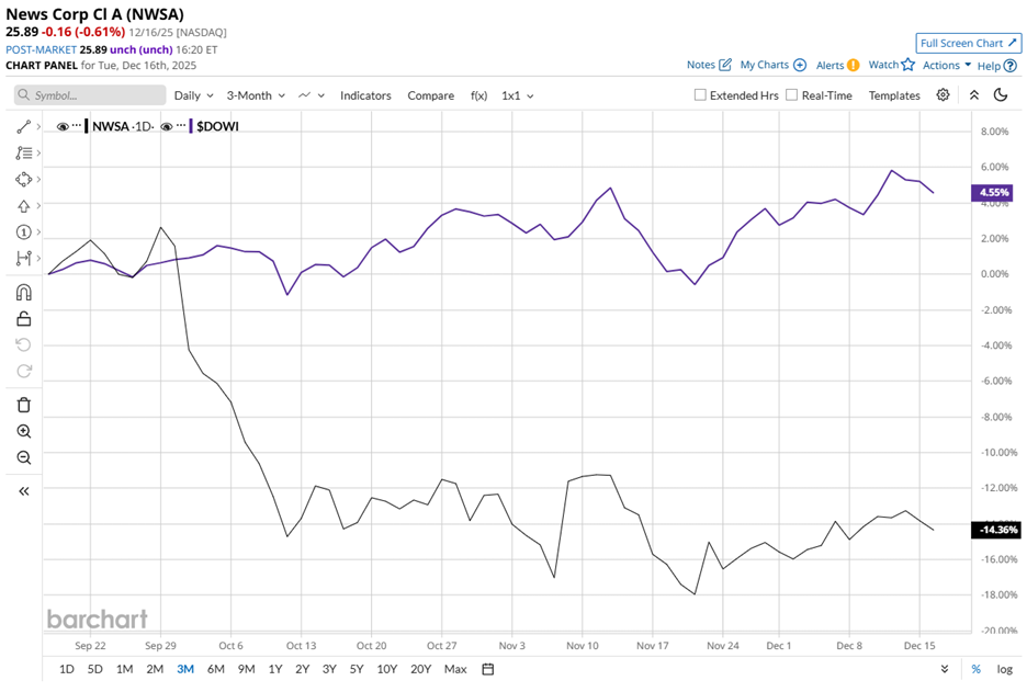The pattern extends beyond the short term. Over the past 52 weeks, NWSA stock slipped 9.6% and fell nearly 6% year-to-date (YTD), while the Dow advanced 10.1% and 13.1%, respectively.