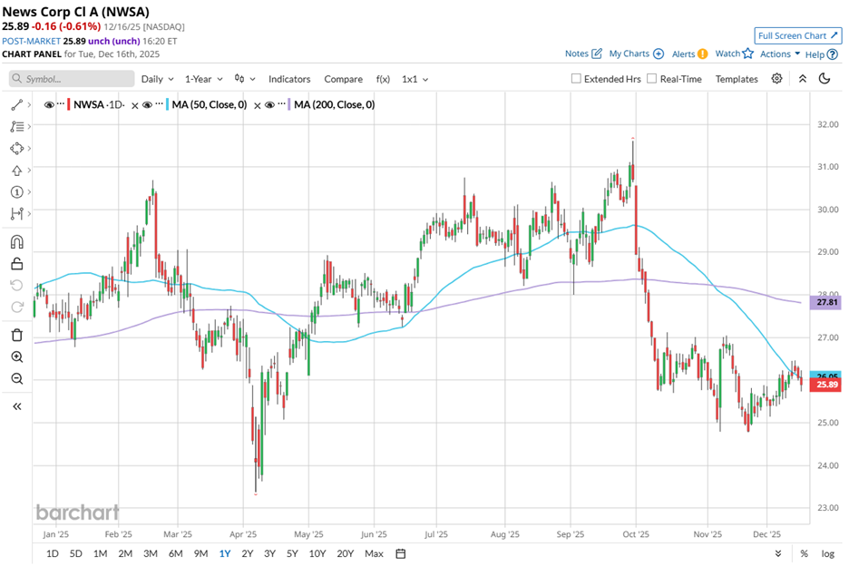 In fact, NWSA stock has been trading below its 50-day moving average of $26.05 and its 200-day moving average of $27.81 since October. Although the stock briefly moved above the 50-day average in December, the subsequent pullback suggests the trend remains in transition as the market searches for clearer directional confirmation.