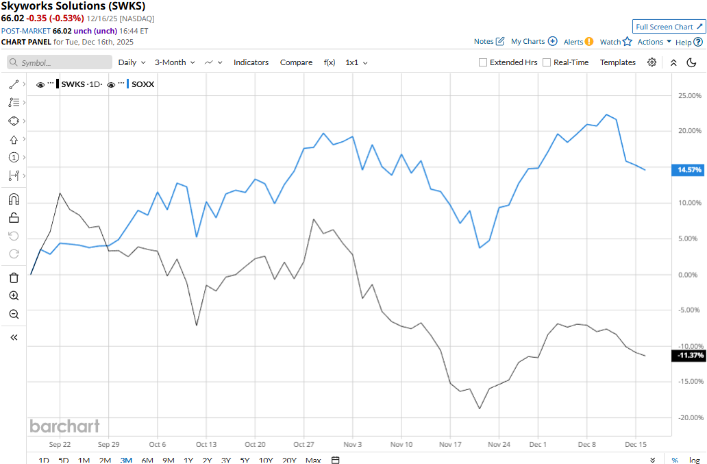 Skyworks touched its 52-week high of $95.46 on Jan. 21 and is currently trading 30.8% below that peak. Meanwhile, SWKS stock has declined 11.1% over the past three months, notably lagging behind the iShares Semiconductor ETF’s (SOXX) 14.6% surge during the same time frame.