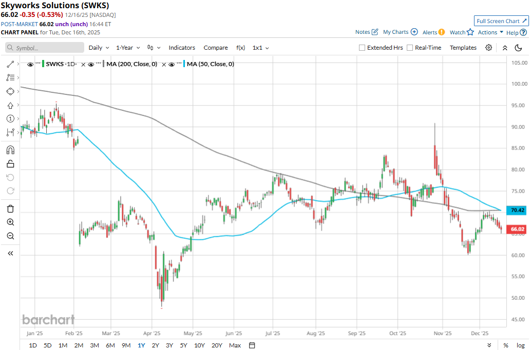 SWKS stock has traded mostly below its 200-day moving average over the past year, with some notable fluctuations and consistently below its 50-day moving average since early November, underscoring its bearish trend.
