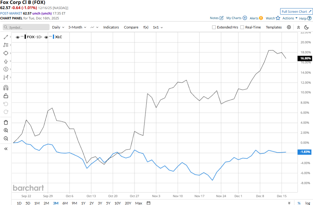 Fox touched its all-time high of $64.22 on Dec. 11 and is currently trading 2.6% below that peak. Meanwhile, Fox’s stock prices have soared 20.3% over the past three months, notably underperforming the Communications Services Select Sector SPDR Fund’s (XLC) 1.6% dip during the same time frame.