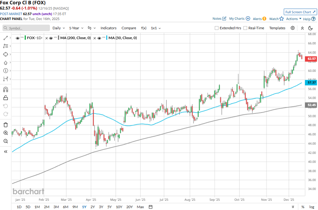 Fox has traded consistently above its 200-day moving average over the past year and above its 50-day moving average since late October, underscoring its bullish trend.