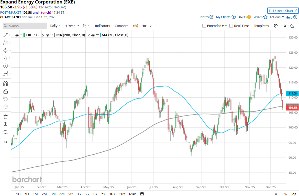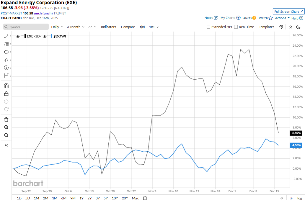 Expand Energy touched its all-time high of $126.62 on Dec. 5 and is currently trading 15.8% below that peak. Meanwhile, EXE stock prices have soared 9.3% over the past three months, outpacing the Dow Jones Industrial Average’s ($DOWI) 5.2% uptick during the same time frame.