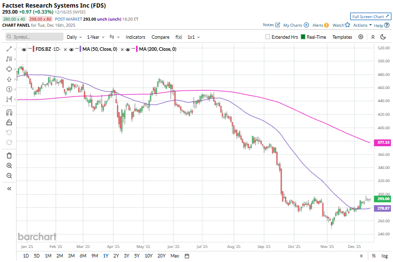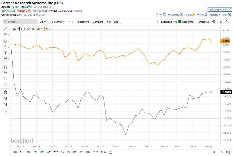Despite its strong market position, FactSet’s stock performance has been notably weak. Shares have fallen 41% from their 52-week high of $496.90, reflecting sustained selling pressure. FDS stock has dropped 15.1% over the past three months, underperforming the Financial Select Sector SPDR Fund’s (XLF) 2% rise during the same period.