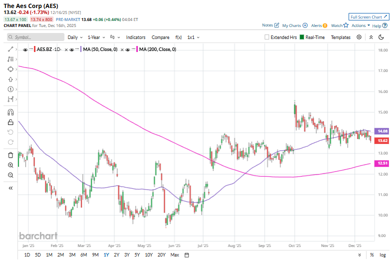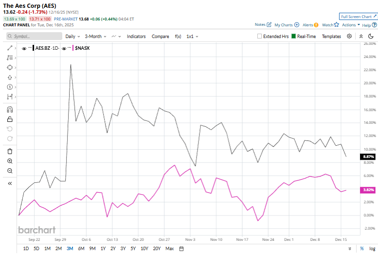 Despite its market stature, AES is still nursing a pullback from its recent peak. The stock is trading 12.2% below its 52-week high of $15.51set on Oct. 1. That said, momentum has improved in the near term, with AES climbing 7.2% over the past three months, outpacing the Nasdaq Composite’s ($NASX) 3.5% rise during the same period.
