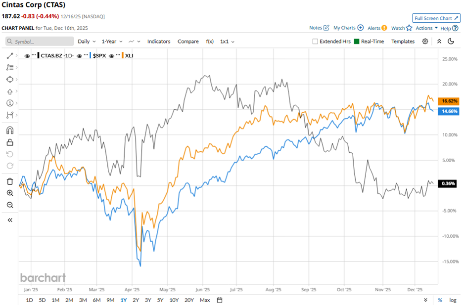 Shares of Cintas have declined 11.4% over the past 52 weeks, underperforming both the S&P 500 Index's ($SPX) nearly 12% gain and the Industrial Select Sector SPDR Fund's (XLI) 13.5% return over the same period.