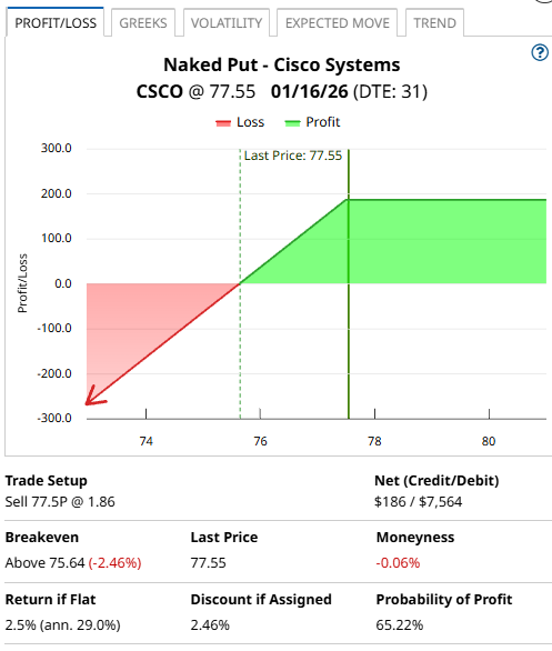 But, if CSCO is trading above $77.50, the put option expires worthless, and the trader keeps the $186 option premium. The net capital at risk is equal to the strike price of $77.50, less the $1.86 in option premium. So, if assigned, the net cost basis will be $75.64. That’s a 2.46% discount from the price it was trading yesterday.