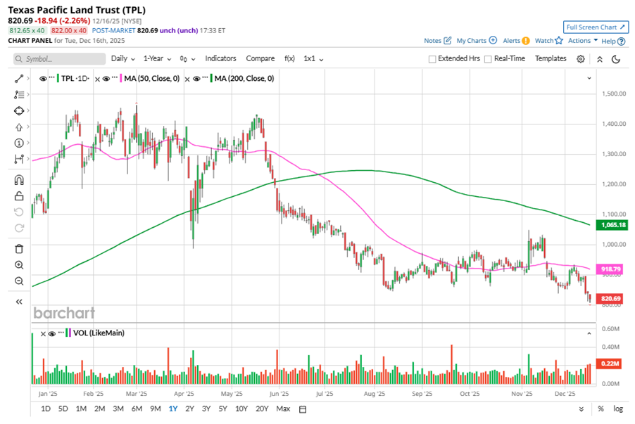 To confirm the bearish trend, TPL has been trading below its 50-day and 200-day moving averages since late May, with some fluctuations.