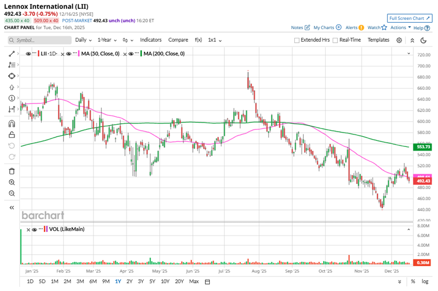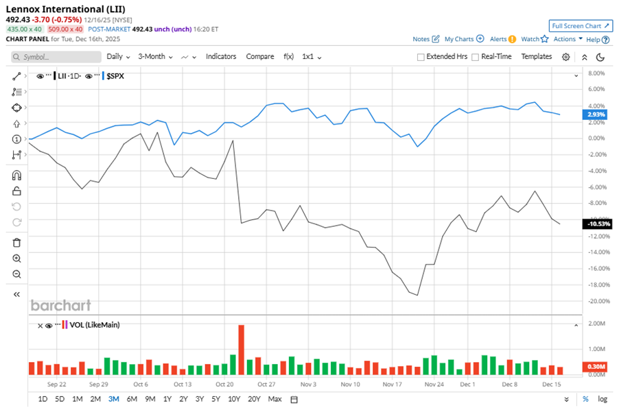 Despite its notable strength, LII slipped 28.6% from its 52-week high of $689.44, achieved on Jul. 23. Over the past three months, LII stock has declined 10.5%, underperforming the S&P 500 Index’s ($SPX) 2.9% gains during the same time frame.