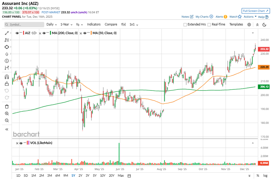 To confirm the bullish trend, AIZ has been trading above its 50-day and 200-day moving averages since early August, with slight fluctuations.