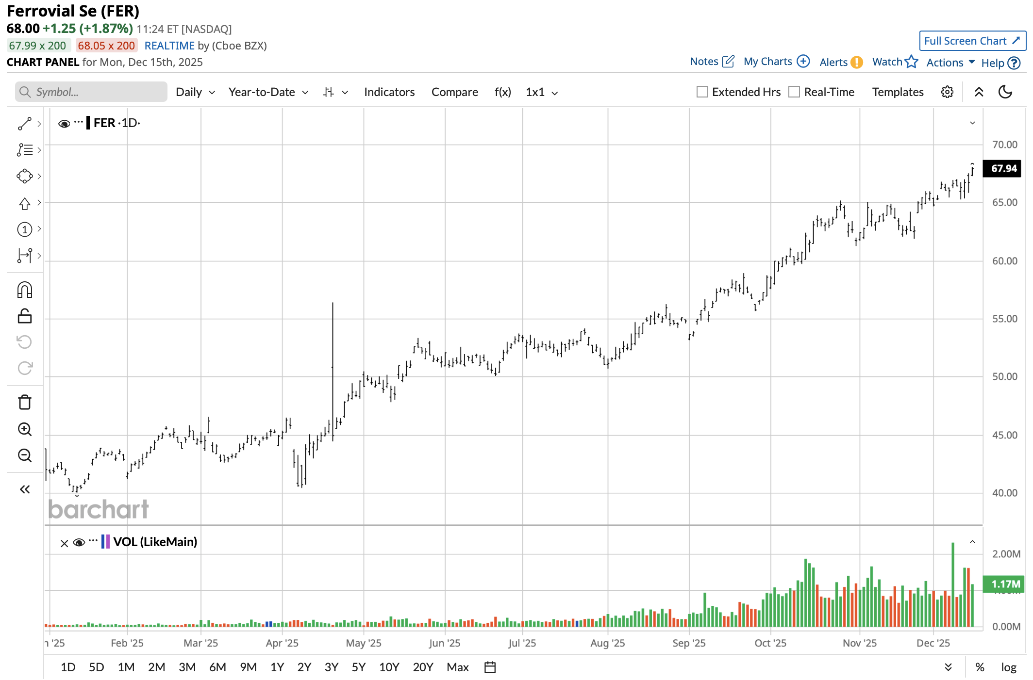 FER stock's performance has been excellent. The stock is currently trading around $68, just under its 52-week high of $68.01. It began this year in the low $40s. This performance exceeds the gain in the S&P 500 Index ($SPX) over the same time frame. The relative strength is very high due to continuous accumulation rather than a one-off surge.