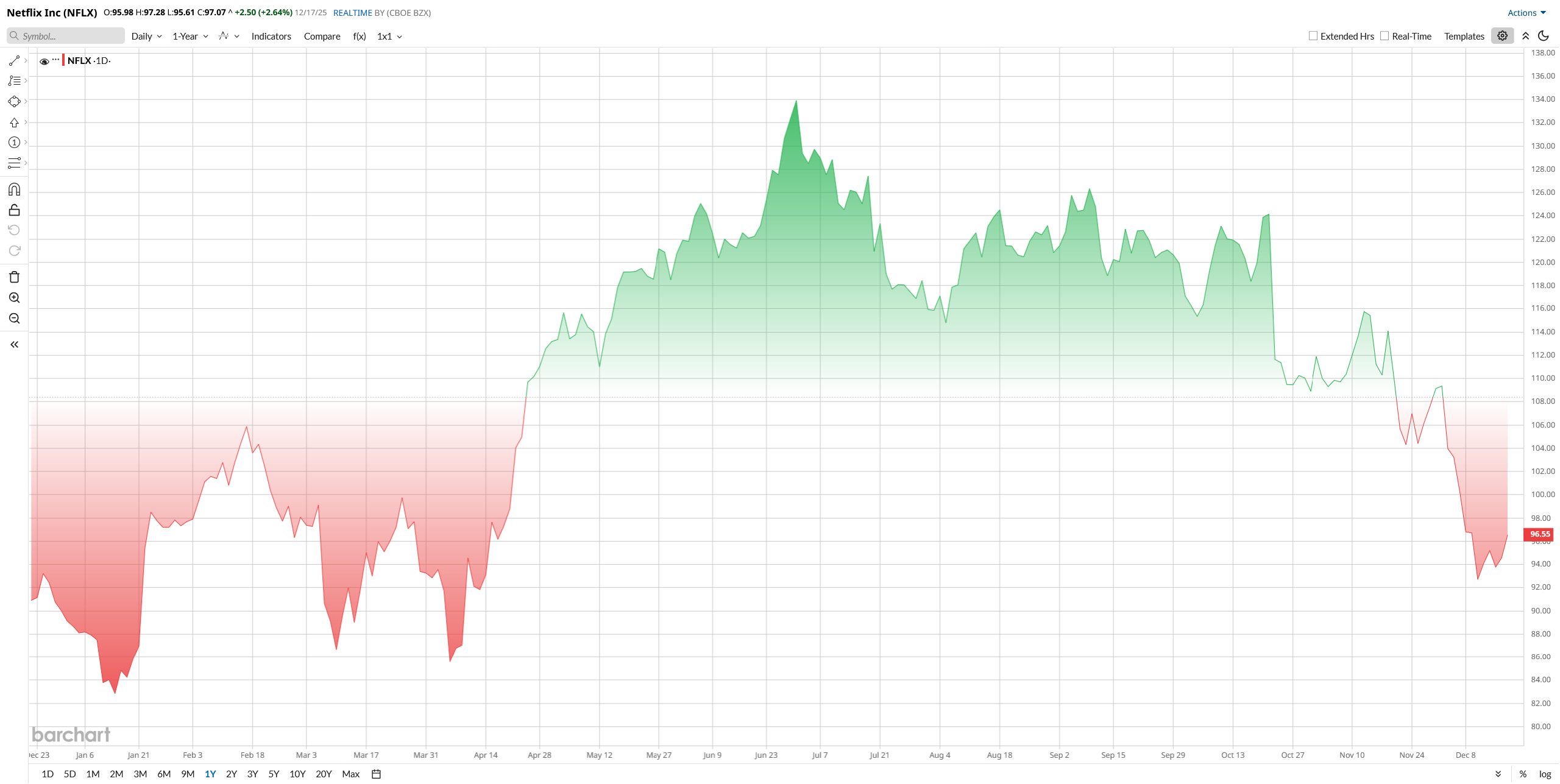 Valued at about $430 billion by market cap, Netflix’s share price climbed modestly in 2025. After an early-year rally driven by subscriber growth and price hikes, the stock peaked near all-time highs in June before pulling back. As of now, Netflix is roughly 8% up year-to-date (YTD) but has fallen roughly 20% since the June high amid concerns over its rich valuation and the proposed Warner Bros. deal.