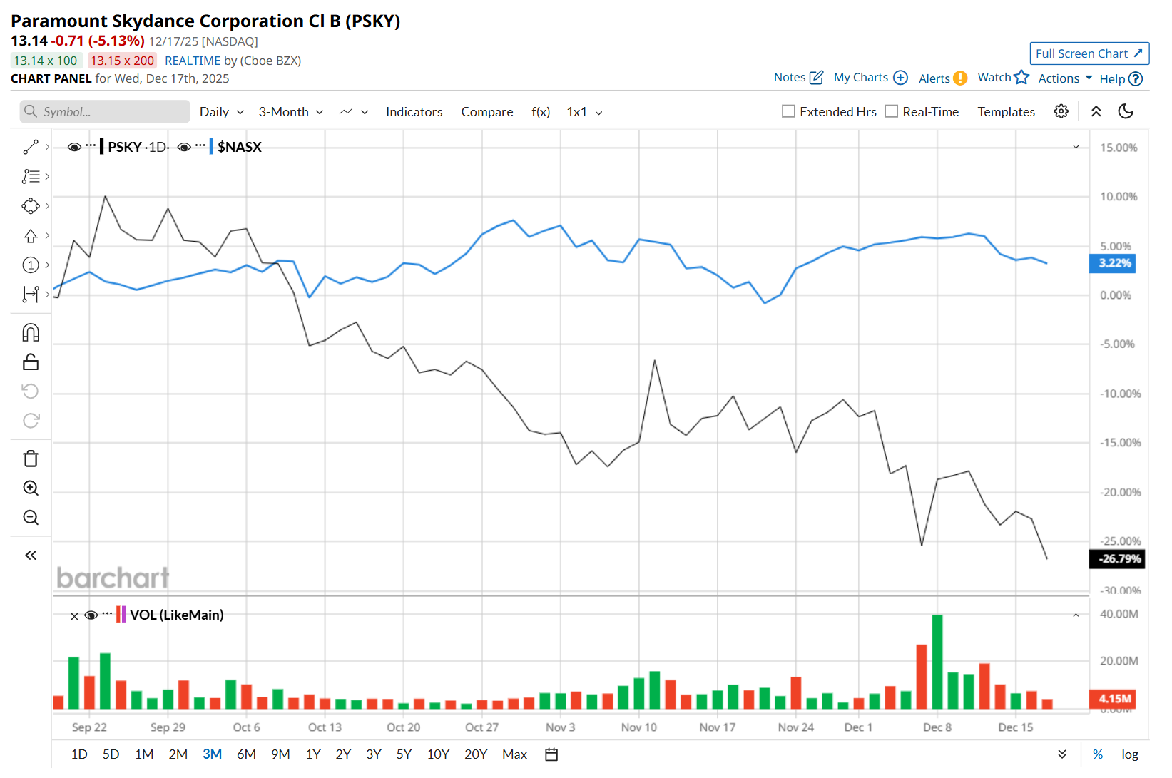 This entertainment company has slipped 36.7% from its 52-week high of $20.86, reached on Sep. 23. Shares of PSKY have declined 25.9% over the past three months, considerably underperforming the Nasdaq Composite’s ($NASX) 3.5% rise during the same time frame.