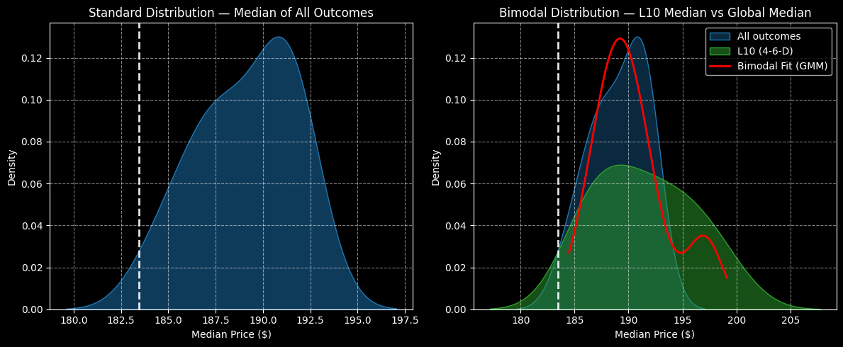 When it comes to PANW stock, the current quant signal is the 4-6-D sequence; that is, in the past 10 weeks, only four of the candlesticks were up weeks. Under this setup, we can expect probability density over the next 10 weeks to rise through $190. From $190 to $195, density declines modestly. Between $195 and beyond, density drops exponentially.