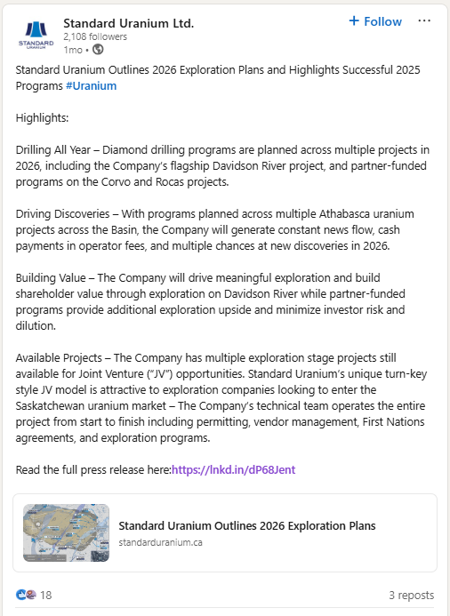 For investors, the appeal is straightforward. Standard Uranium offers concentrated exposure to the Athabasca Basin, a disciplined project generator model that limits dilution, multiple shots on goal through partner-funded drilling, and a near-term catalyst path that aligns with a tightening uranium market.