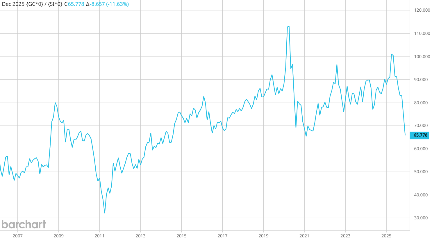 Right now, the ratio sits near 65, a level that has repeatedly acted as a turning point historically.