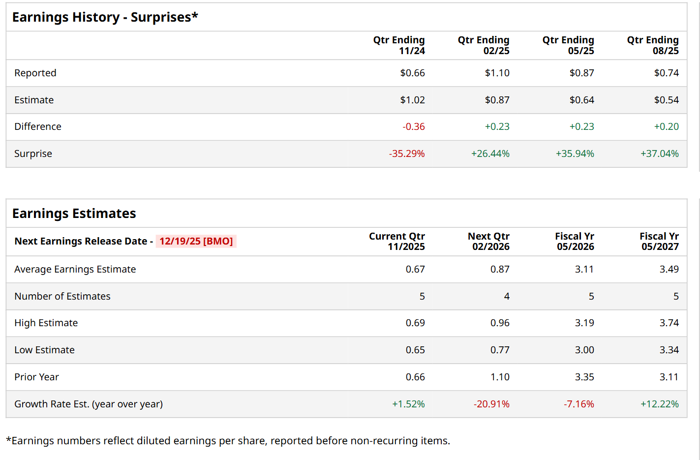 Eagle, Idaho-based Lamb Weston Holdings, Inc. (LW) is a food processing company that specializes in frozen potato products. Valued at a market cap of $8.3 billion, the company is one of the world’s largest producers and distributors of frozen french fries and other value-added potato products, serving restaurants, quick-service chains, foodservice operators, and retail customers. It is scheduled to announce its fiscal Q2 earnings for 2026 before the market opens on Friday, Dec. 19.