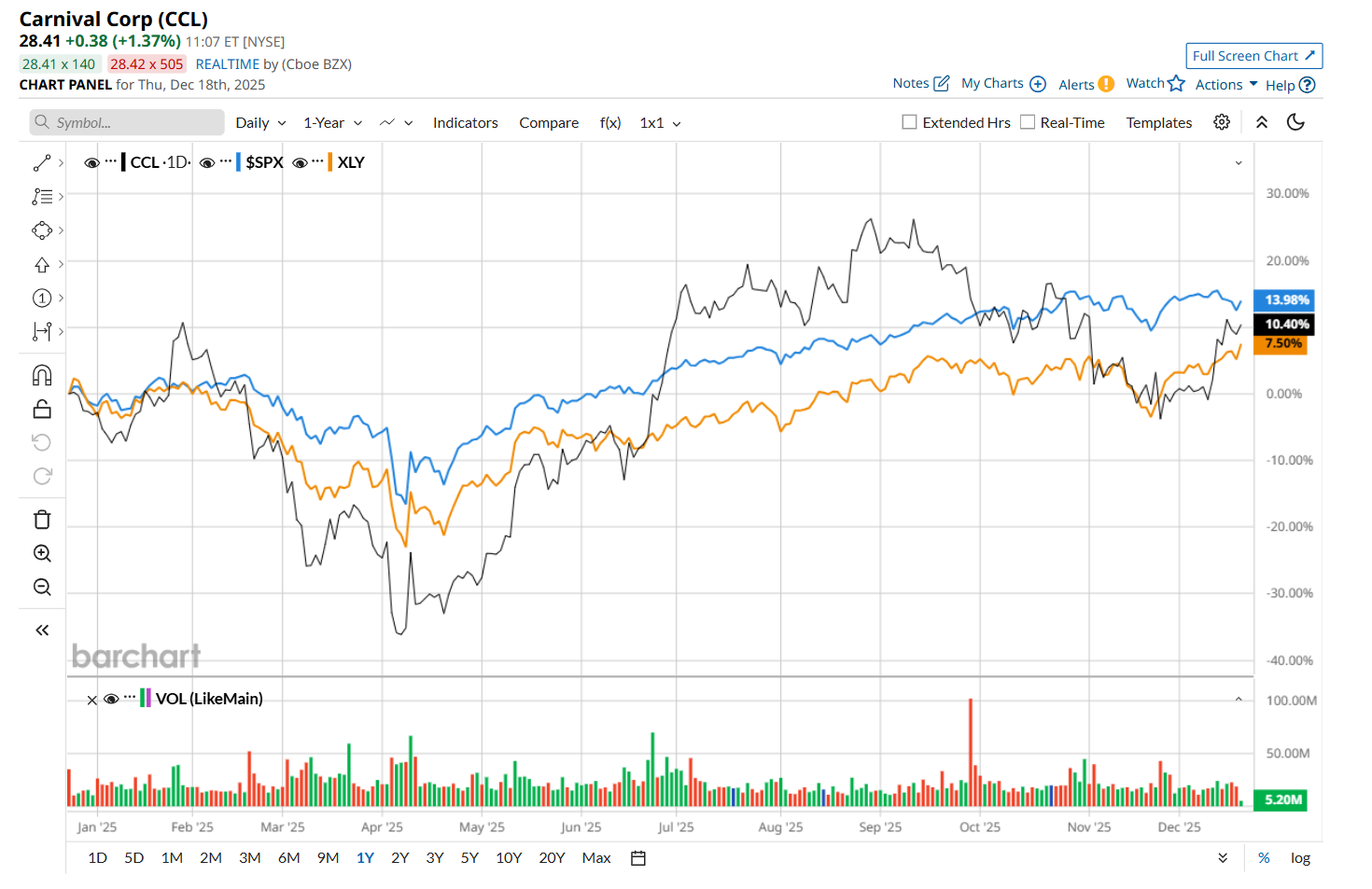 CCL has gained 14.2% over the past 52 weeks, outperforming both the S&P 500 Index's ($SPX) 11.1% return and the State Street Consumer Discretionary Select Sector SPDR ETF’s (XLY) 7.4% uptick over the same time period.