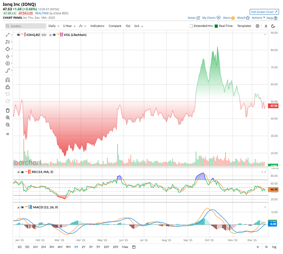However, that rally proved overheated. Since then, IONQ has retraced roughly 43.6% from its peak, settling slightly over the mid-$40s. Even so, the bigger picture remains constructive, with the stock still up about 25.9% over the past 52 weeks and 19.14% over the last six months.