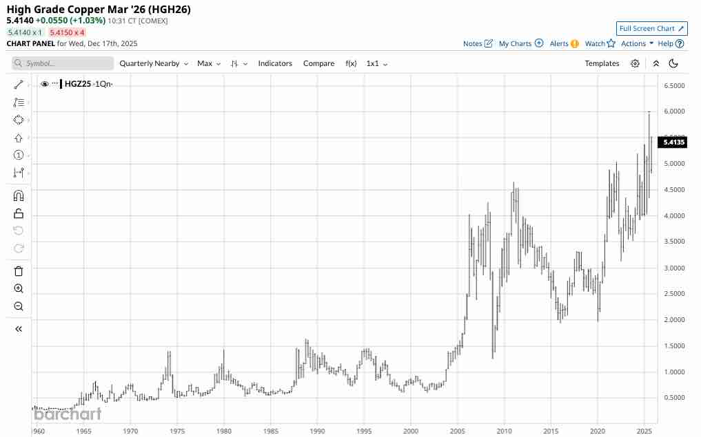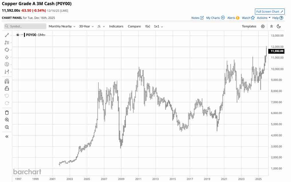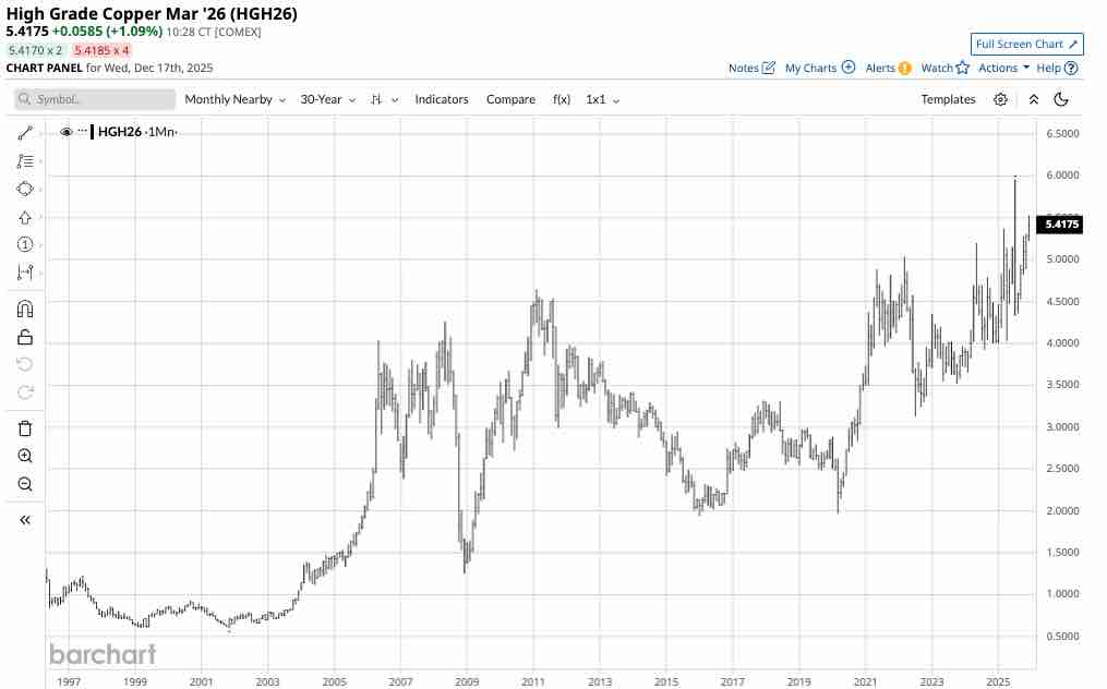 The 30-year monthly COMEX copper futures chart highlights copper’s ascent to two new record peaks in 2025.