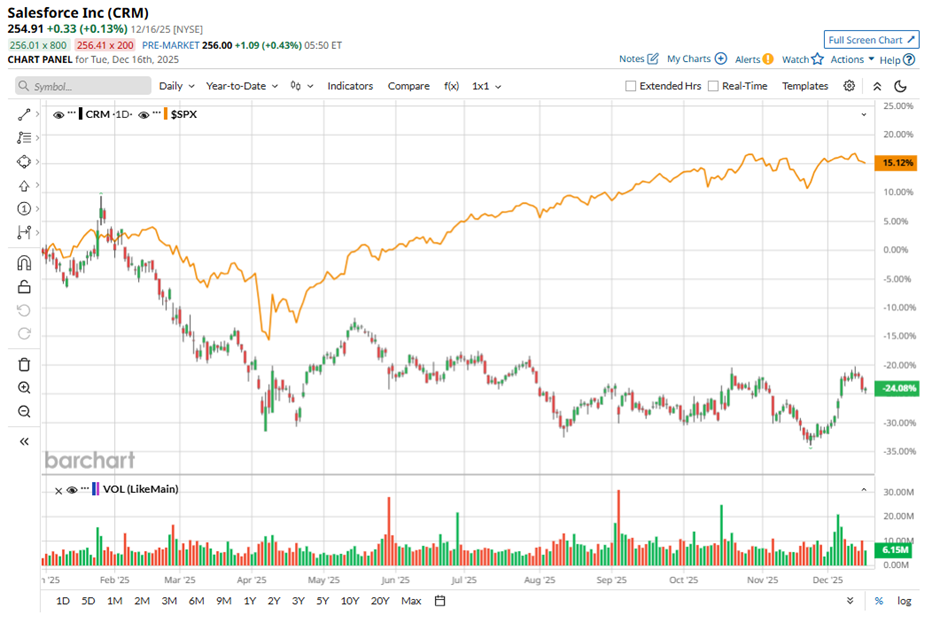 Taken together, Salesforce delivers a more intelligent and intuitive approach to managing customer relationships in a rapidly evolving digital landscape. Its ecosystem also includes well-known platforms such as Slack, Tableau, and MuleSoft. But even with its scale and influence in enterprise software, the company’s ride on Wall Street hasn’t been entirely smooth sailing in 2025.