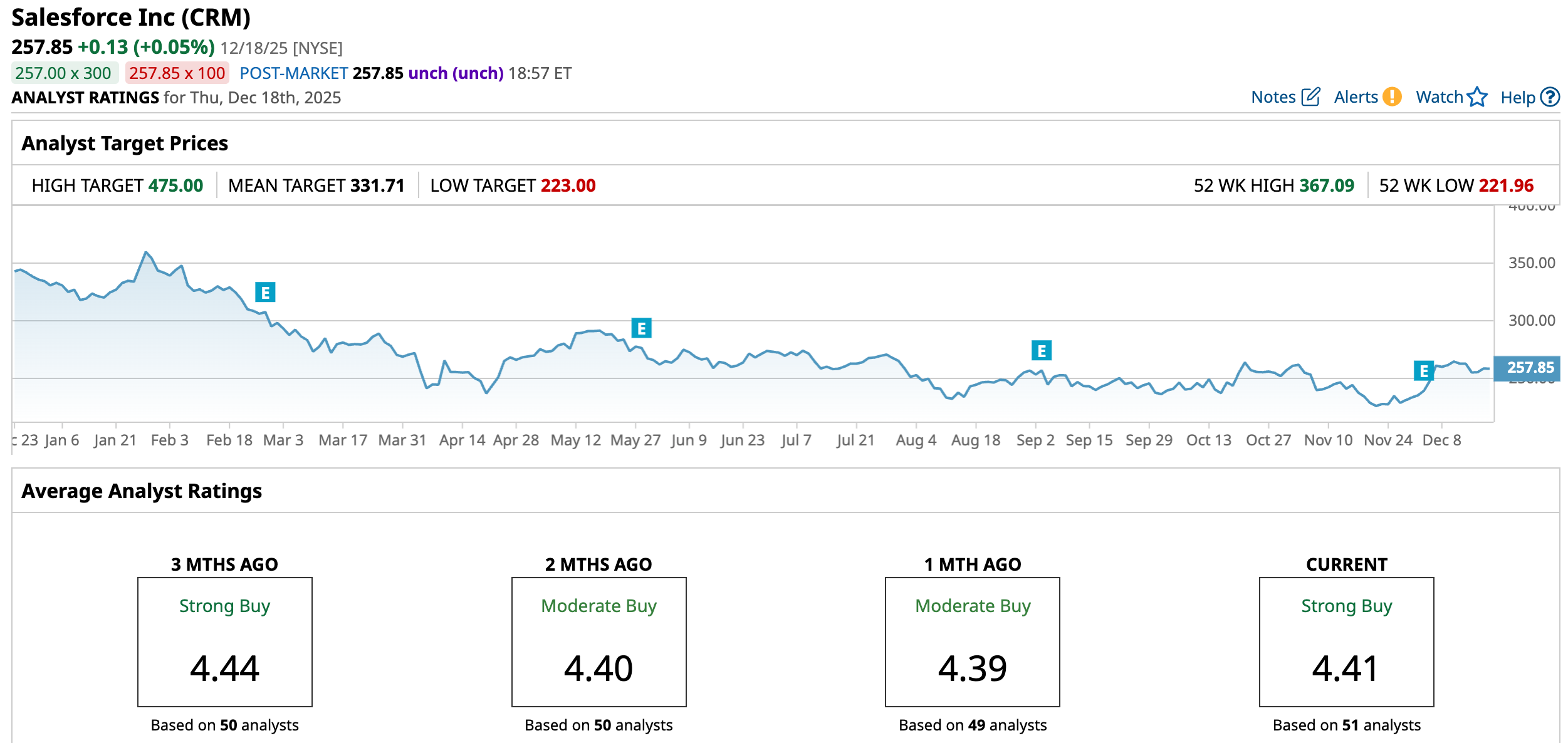 Worries around a potential AI bubble, intensifying competition in the enterprise software space, slowing revenue growth, and even fears that powerful AI tools could one day replace the very software platforms Salesforce builds have all weighed heavily on the stock. Still, the narrative around Salesforce is starting to improve. The company’s latest earnings report has helped restore a measure of investor confidence, and analysts are beginning to warm up again.