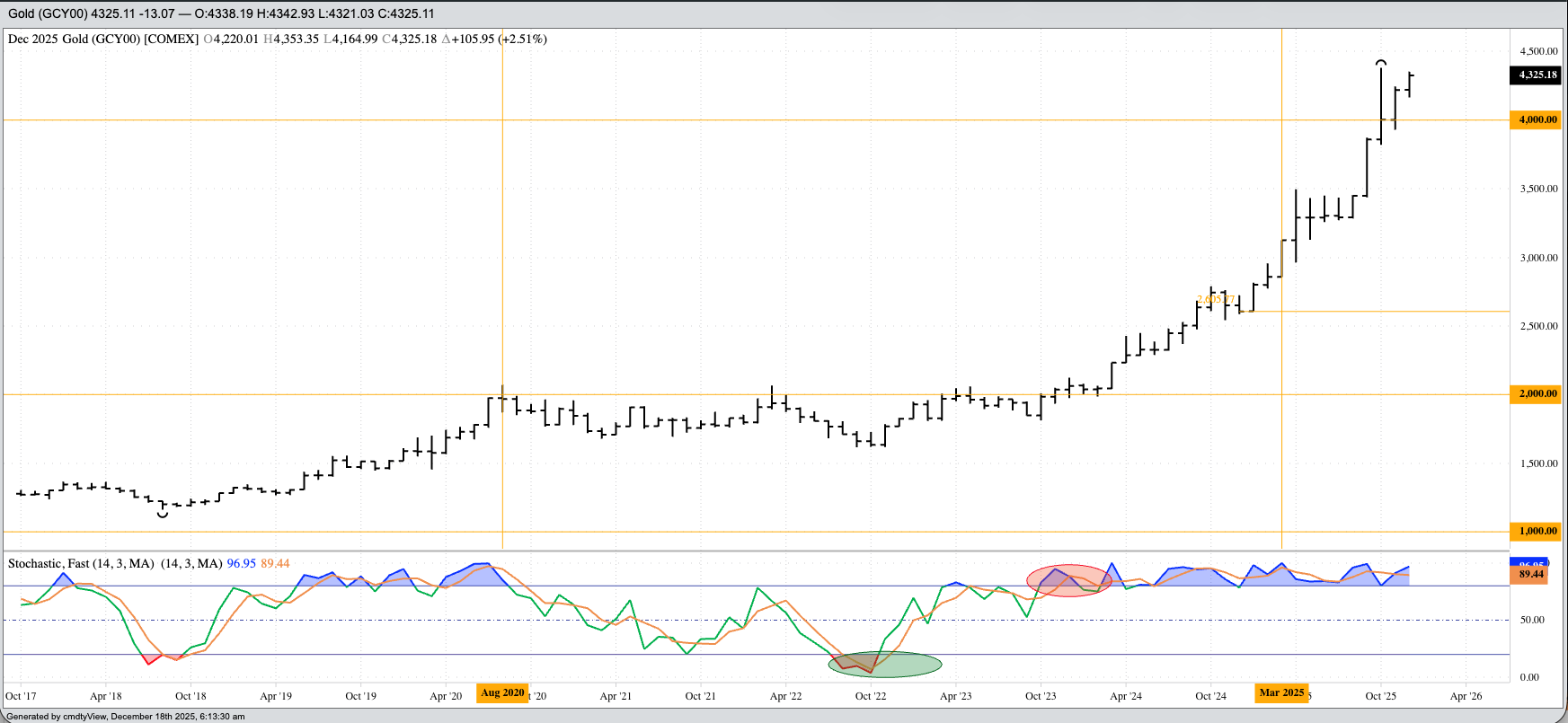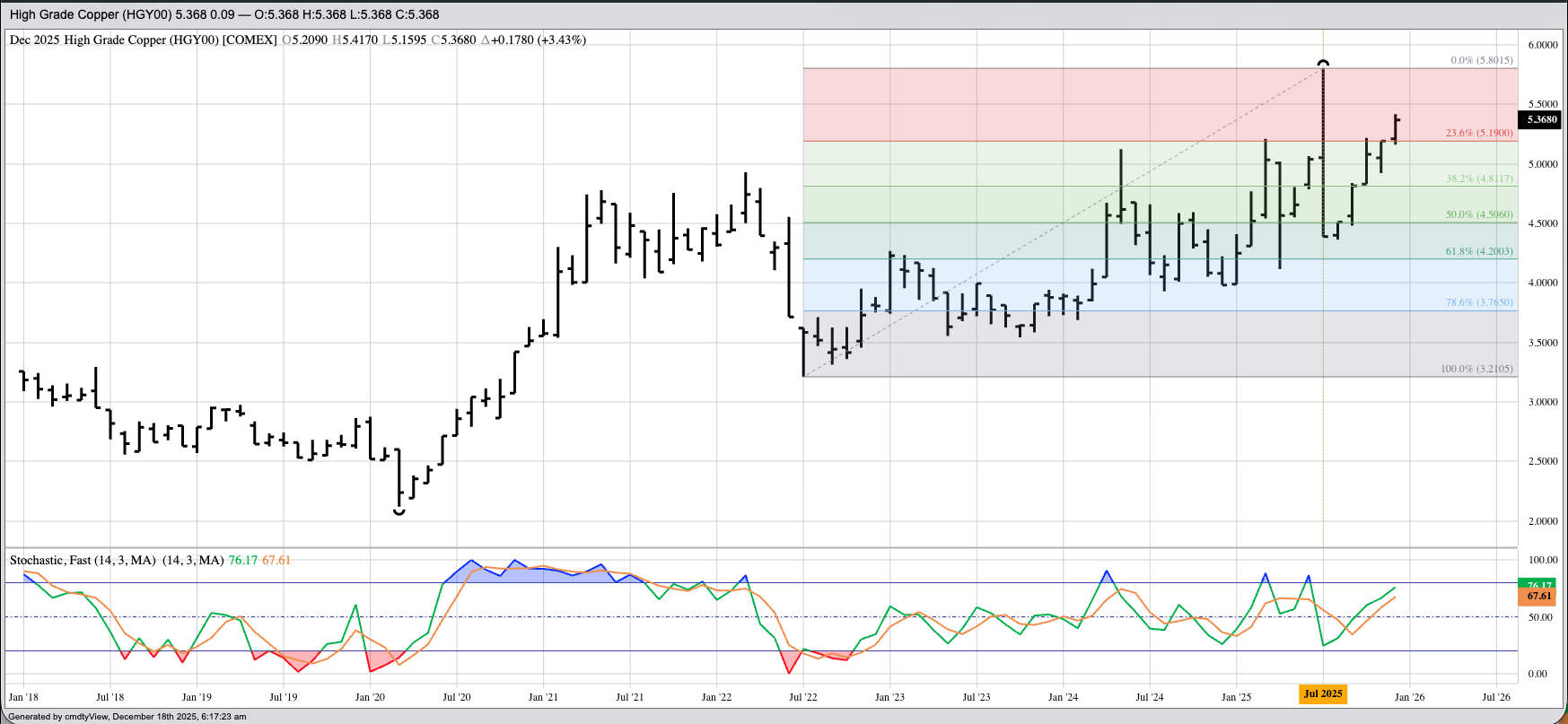 Speaking of gold, the Cash Index (GCY00) has recovered from its recent break, posting a December high of $4,353.35, just short of its all-time mark of $4,381.21 set during October. Recall at the time I talked about how the Index had flown through the $4,000 psychological barrier like a runaway train, though algorithms do not have a psyche, putting the spotlight on $5,000. And while my interpretation of the market’s Fibonacci sequence led to the conclusion the Index could hit the next big round number that same month, gold promptly ran out of bullish momentum short-term. The Index closed October priced at $4,002.85, still up $144.34 (3.7%) for the month and still above the big round number of $4,000. The last couple months have seen a steady, consistent climb as central banks around the world continue to buy. But they aren’t alone. Another point Mr. Meyer made is the strength in gold has been supplemented, but not drive, by investor buying. In my opinion, this is where the occasional sharp breaks come from as investor move money around, with the steady base of central bank buying providing support. Looking at the gold/copper ratio and we see the outlook for at least early 2026 continues to be one of economic concern (copper) and safe-haven buying (gold).