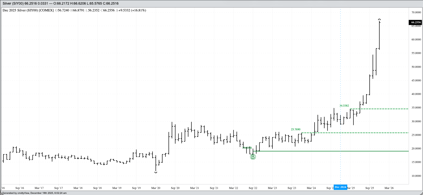 - The Cash Silver Index has posted a high near $66.88 during December, up 131% for the year.