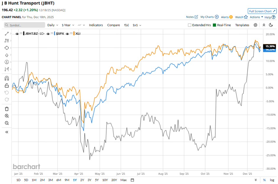 JBHT's shares increased 15.3% over the past 52 weeks, lagging behind both the S&P 500 Index's ($SPX) 15.4% gain and the Industrial Select Sector SPDR Fund's (XLI) 16.7% return on a YTD basis.