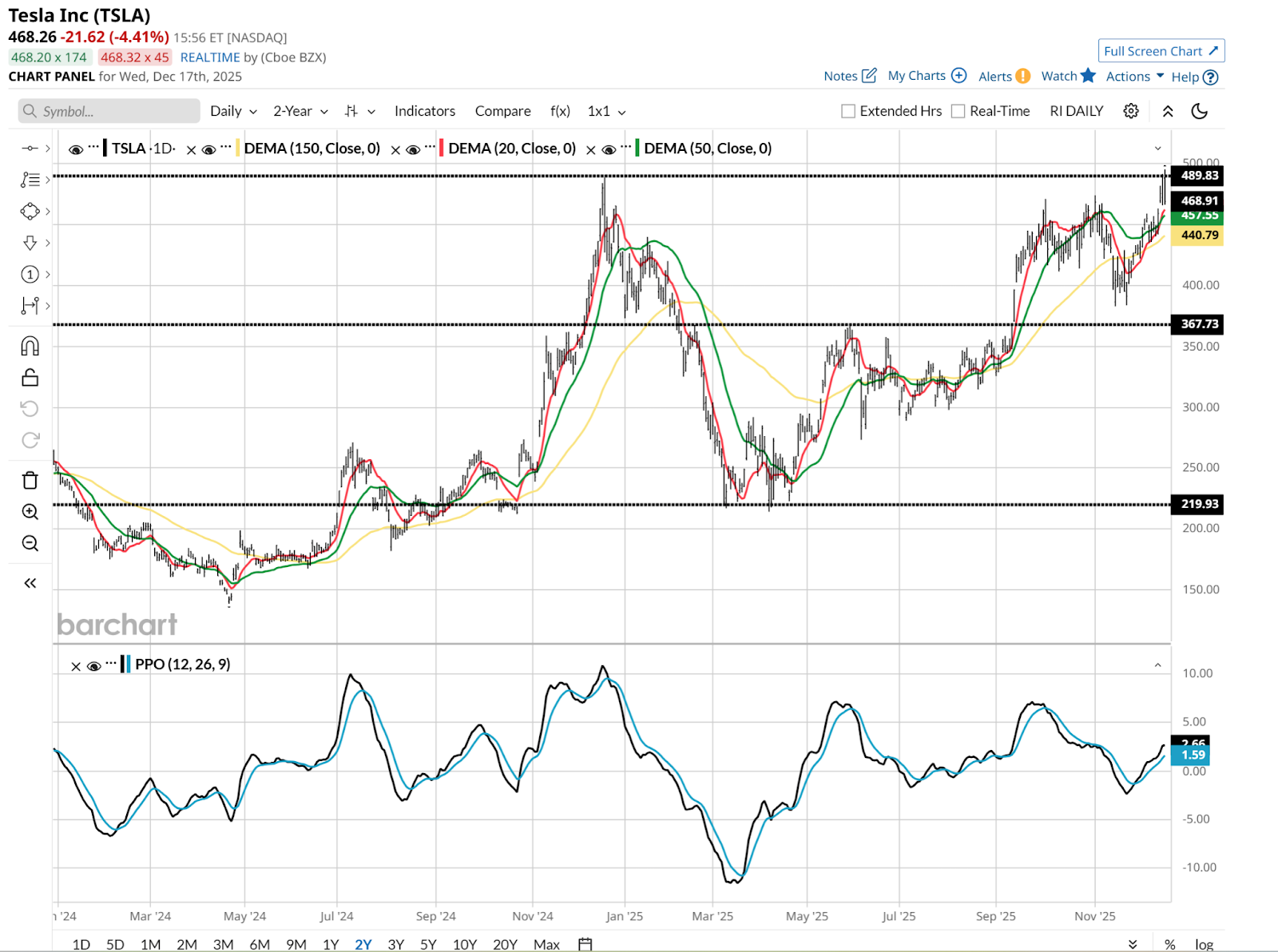 The company has had a tumultuous year, which started with the Department of Government Efficiency (DOGE) in DC, continued with a pay package for the ages, and currently could be described as a double top. As in, the stock price’s return to the $490 area.