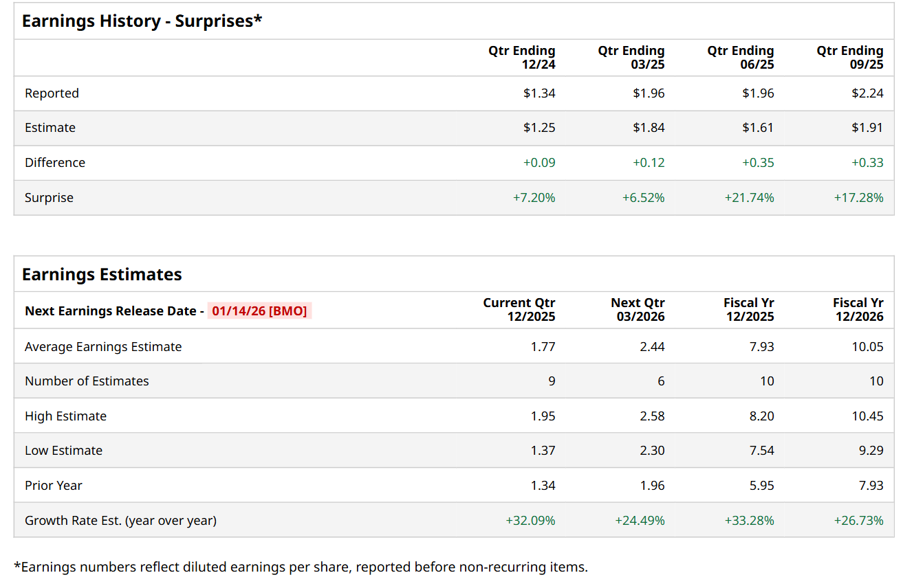 New York-based Citigroup Inc. (C) is a global financial services company that provides a broad range of financial products and services, including treasury and trade solutions, investment banking, global markets trading, and retail banking to consumers, corporations, and governments. Valued at a market cap of $201.9 billion, the company is scheduled to announce its fiscal Q4 earnings for 2025 before the market opens on Wednesday, Jan. 14