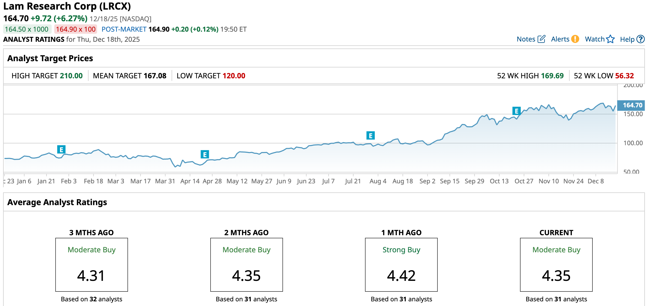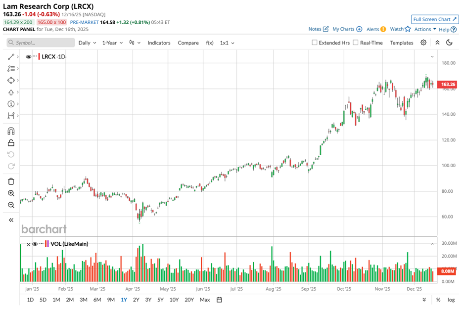 Moreover, Lam Research rewards shareholders through steady dividends, maintaining an 11-year streak. It pays an annual $1.04 dividend, yielding 0.64%, with the most recent $0.26 installment scheduled for Jan. 7, 2026, to shareholders of record as of Dec. 3.