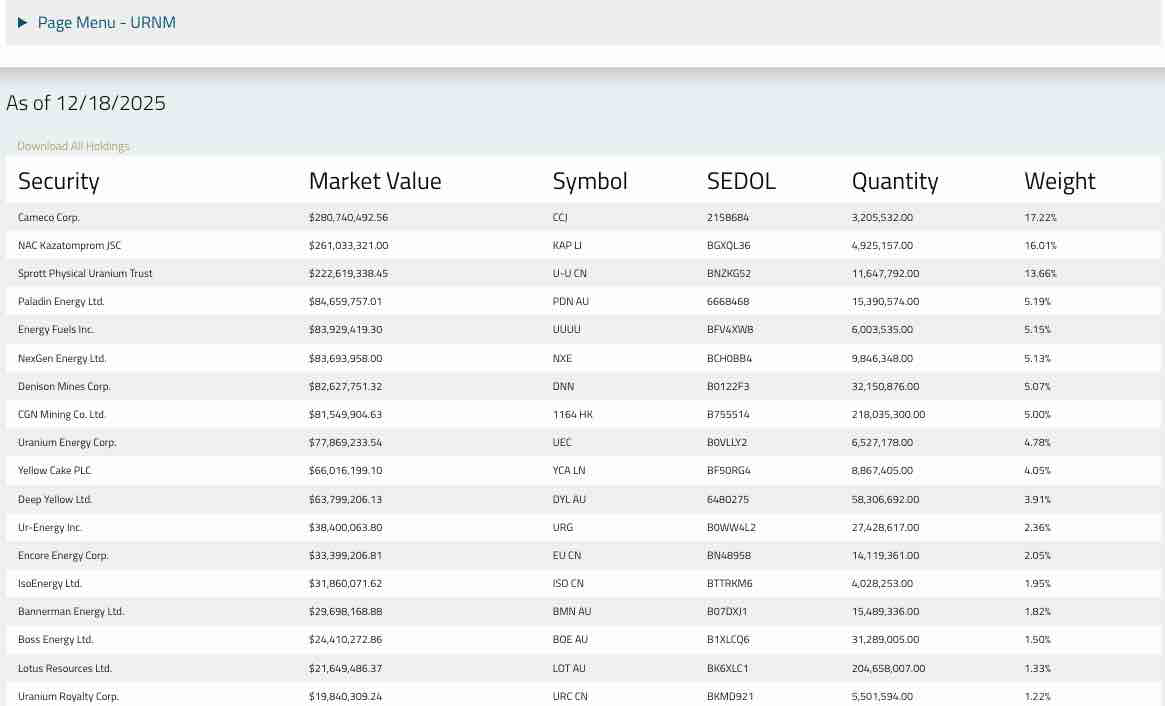 The top holdings of the Sprott Uranium Miners ETF (URNM) include:
