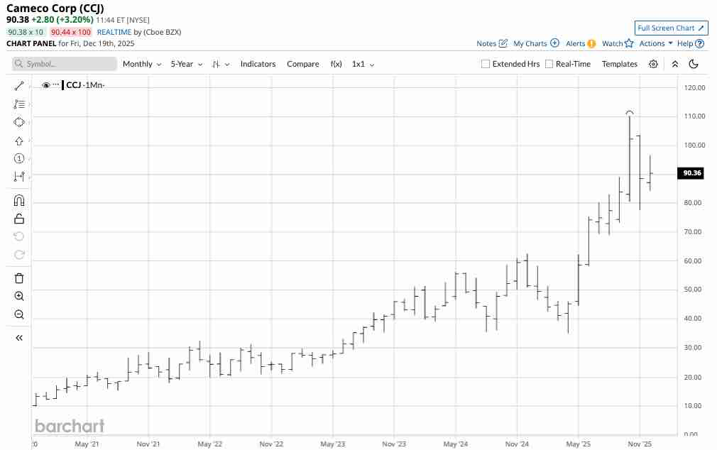 The five-year chart highlights CCJ’s bullish trend. In 2025, CCJ rose 114.4% from $51.39 at the end of 2024 to a high of $110.16 per share in October 2025. At over $90 per share, CCJ shares remain not far below the October peak.