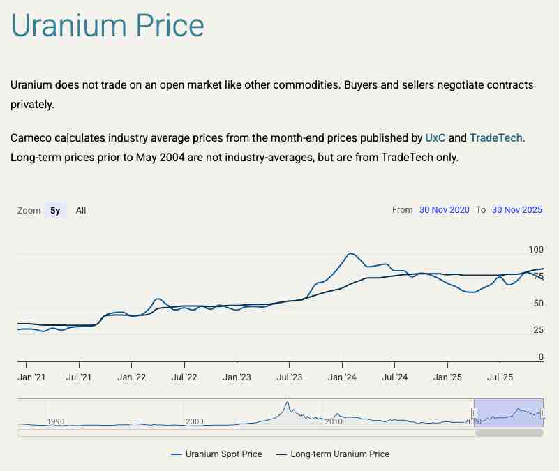 At the end of November 2025, Cameco’s spot price was lower at $75.80, with the long-term price higher at $86.00. The five-year chart highlights the mostly bullish trend in uranium prices.