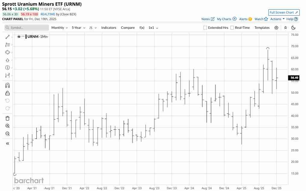 The monthly chart highlights URNM’s over 70% 2025 gain, moving from $40.31 at the end of 2024 to the October 2025 high of $68.55 per share. At above $56 in mid-December, URNM is above the midpoint of the 2025 trading range.