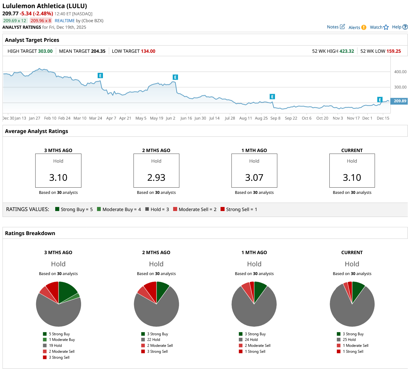 Out of the 30 analysts covering LULU stock, three recommend “Strong Buy,” 25 recommend “Hold,” one recommends “Moderate Sell,” and one recommends “Strong Sell.” The average LULU stock price target is $204.35, which is below the current price of $210.