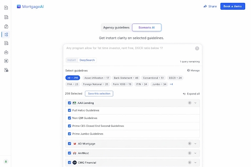 This is the "killer feature" for me. In our industry, being "mostly right" means you are wrong and getting sued or having to buy back a loan. Scenario AI provides Citations with every answer. It doesn’t just say "Yes, they qualify." It says "Yes, per Section 3.4 of the AD Mortgage guideline," and links to the source. This DeepSearch capability allows you to select specific guidelines to check against. You can trace the answer back to the source document. This eliminates the "Black Box" anxiety of AI. If an underwriter challenges you, you have the citation ready to defend your file.