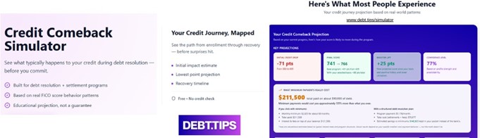 While debt relief providers are required to disclose potential credit impacts, many consumers struggle to translate those disclosures into practical expectations. DEBT.TIPS developed the simulator to make that information more accessible and easier to understand through structured projections.