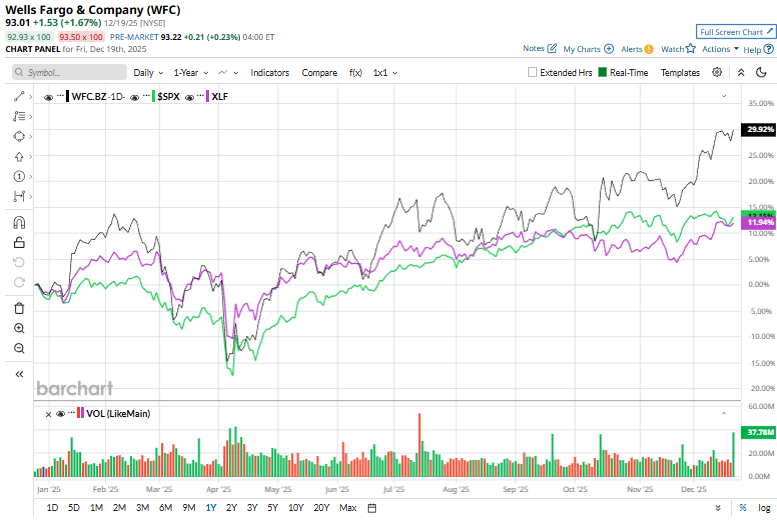 WFC’s stock prices have surged 35.1% over the past 52 weeks, outpacing the S&P 500 Index’s ($SPX) 16.5% gains and the Financial Select Sector SPDR Fund’s (XLF) 14.7% returns during the same time frame.