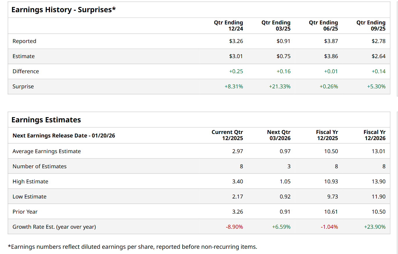 Ahead of this event, analysts expect this airline company to report a profit of $2.97 per share, down 8.9% from $3.26 per share in the year-ago quarter. The company has surpassed Wall Street’s bottom-line estimates in each of the last four quarters. In Q3, UAL’s EPS of $2.78 exceeded the forecasted figure by 5.3%.