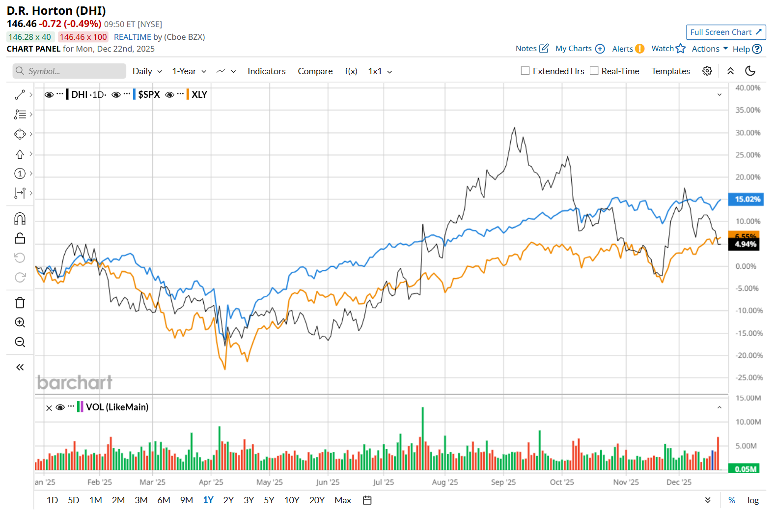 Shares of DHI have gained 7.2% over the past 52 weeks, trailing behind the S&P 500 Index's ($SPX) 16.5% return over the same time frame. However, it has outpaced the State Street Consumer Discretionary Select Sector SPDR ETF’s (XLY) 6.8% uptick over the same time period.