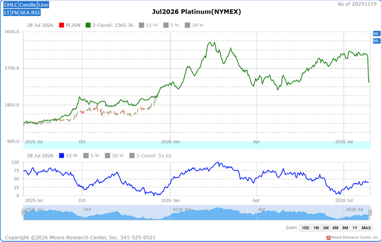 Currently, platinum is trading similarly to the two previous years, 1980:90% and 2000:84% (green). The current uptrend is breaking out to the upside, as did the correlated years. What's interesting is that the peak of these correlated years occurred in mid-February. For traders looking for a window to identify value in the platinum market, early and late January have seen a measurable price pullback.Â