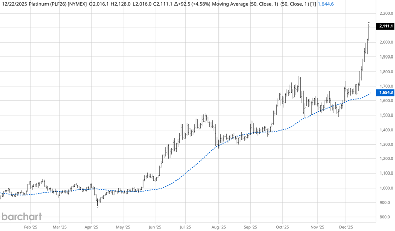 The platinum market has been on a tear lately, mirroring the broader frenzy in precious metals that has gotten everyone from day traders to institutional investors buzzing. Right now, these markets look seriously overextended, with prices surging way past their fundamentals in a classic case of momentum chasing. Take platinum itself—its nearby futures continuous chart price traded at $2,128.0, which is comfortably above the 50-day simple moving average (blue) and approaching its all-time high in 2008 of $2,308.8.Â