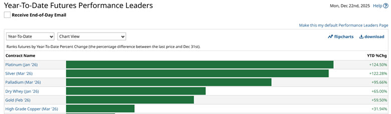 Gold and silver aren't far behind, both trading well north of their 50-day averages, too, suggesting the whole sector's stretched thin after months of upward pressure from economic uncertainty (tariffs) and interest rate jitters. That said, these metals have delivered some impressive runs, turning early buyers into happy campers with gains that'd make anyone's portfolio shine. Barchart's Year-To-Date Performance Leaders shows that 5 of the top 6 markets are metals.Â